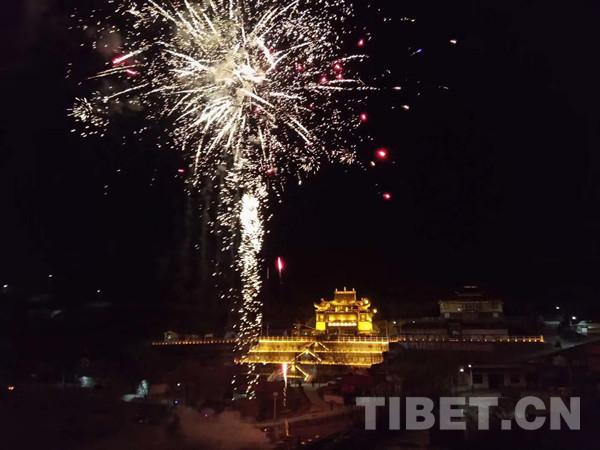 藏历正月十五是藏传佛教寺院向信众展示酥油花的日子。卓尼县的信教群众一早就来到寺院中为家人祈福,游客们也争相前来一睹民俗文化遗产酥油花的绚丽风姿。图为烟花中的寺庙。(中国西藏网 文/宋家丽 图/松赞)
