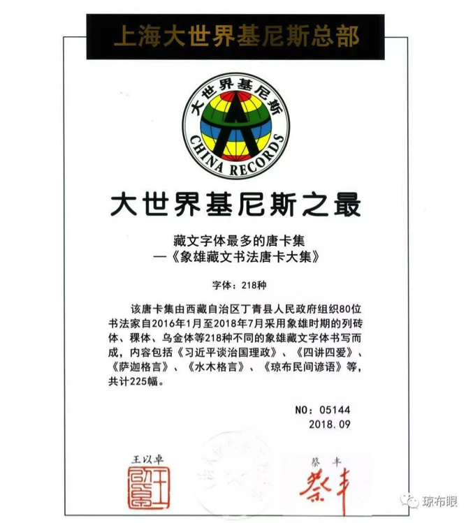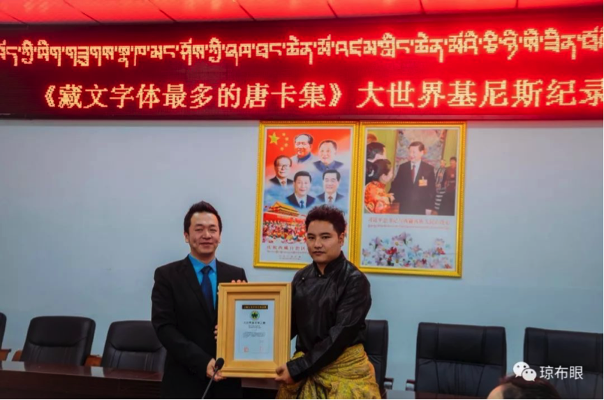琼布丁青是琼文化的发祥地,同时也是藏文书法大家琼布玉赤的诞生地,有“中国藏文书法之廪”的美誉。在这样的文化环境熏陶下,出现了许许多多做文化事、行文化路的人民宣传员,他们用最实际的行动表达着对非遗琼布书法的热爱。“本次能获得《藏文字体最多的唐卡集》大世界基尼斯纪录是丁青人民文化宣传员呕心沥血历经两年收集、制作所得到的回报,是坚定文化自信、坚持文化强国在中华大地的又一次伟大实践。”丁青县文物局相关负责人希望,通过申请大世界基尼斯之最,把弘扬优秀传统文化和发展现实文化有机结合在一起,活态呈现活力继承,以琼文化为品牌,全面推进社会主义文化强县建设,让非物质文化遗产活起来、用起来,谱写丁青文化事业的新辉煌。
