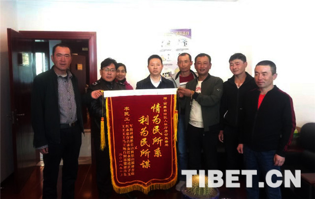 图为祁某等14名农民工为西藏自治区人社厅送锦旗。