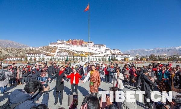 中国西藏网讯 2018年12月31日,年终岁末,西藏自治区拉萨市布达拉宫广场上演了《我和我的祖国》快闪活动。来自西藏的高校青年学生和市民群众向祖国深情告白,用快闪的方式庆祝新中国成立70周年。
