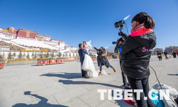 冬日的布达拉宫广场上,身着盛装的市民群众三三两两的有说有笑;前来旅游的游客拉着行李箱漫步其中;不畏严寒拍摄婚纱照的新人露出甜蜜的笑容。