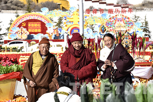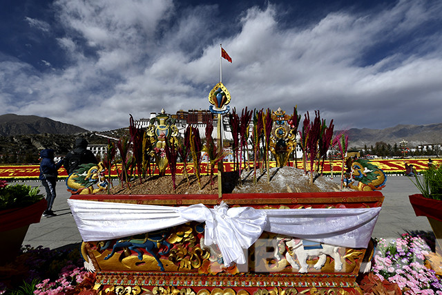 随着工作人员按照规划有序地将仿真花卉和绢花摆放,布达拉宫广场上,藏汉双语的“欢度春节藏历新年”字样逐渐成型。待巨大的切玛盒摆放到位后,工作人员在切玛盒两侧分别放入青稞和刚刚炒制出的糌粑,随后插上绽放在新年里的“罗萨梅朵”,装扮布达拉宫广场。