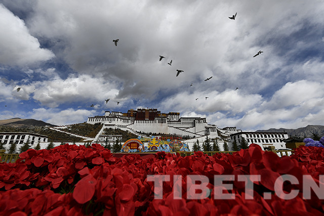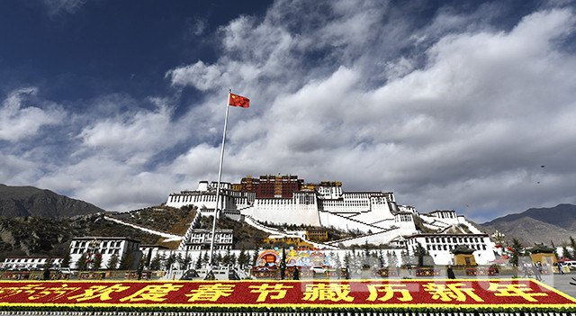 拉萨市园林局负责人介绍,3000多盆仿真花卉和4万余束红黄两色的绢花用在布达拉宫广场中心位置进行地面装饰,营造春节、藏历新年的浓厚氛围。