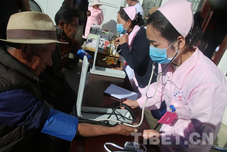 图为3月20日,解放军陆军第954医院医护人员为琼结县群众测量血压。