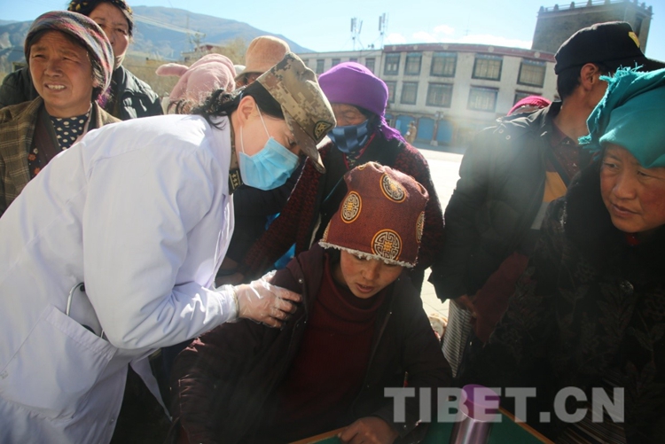 图为3月20日,解放军陆军第954医院妇科副主任医师宁萃秀为琼结县群众体检。
