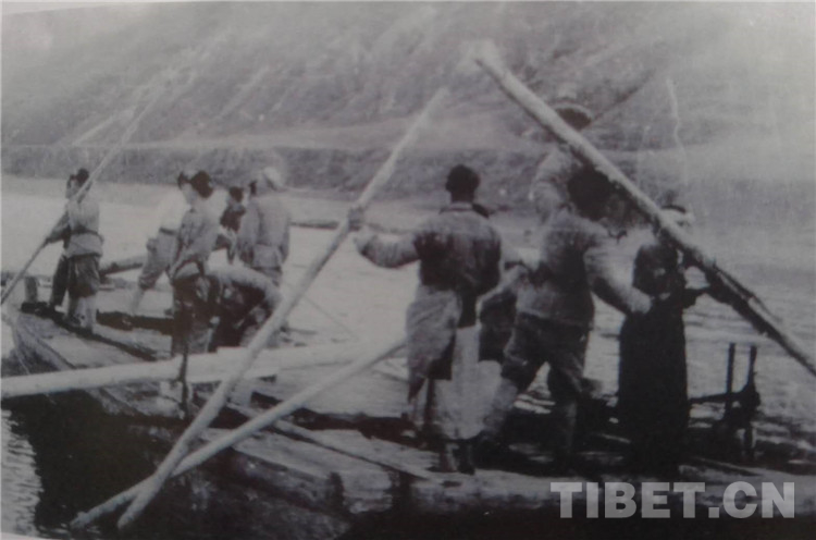 图为1950年7月,154团在金沙江上造的第一艘能载汽车的大木船。