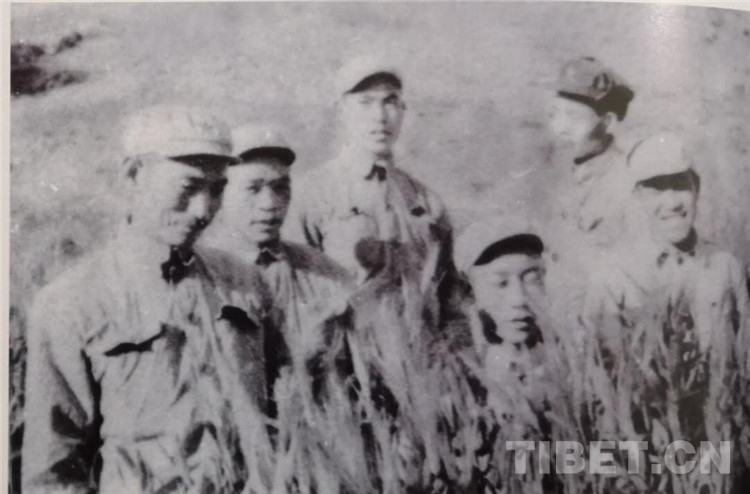 图为1951年8月,先遣154团在生产基地的青稞地里分享丰收的喜悦。左起保卫股长洪振寰、技术书记胡翼程、副正教孙从善、杨军、郄晋武、见习干事殷继凡。