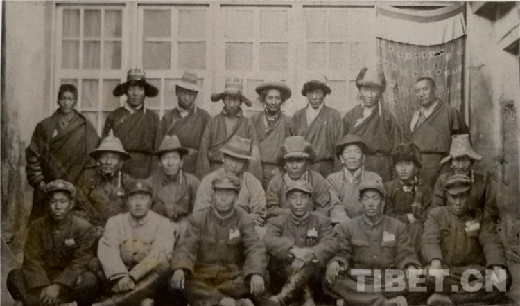图为1951年11月22日,进藏先遣团举行江孜上层第一次茶话会,经过座谈协商解决了部队采购、开荒生产土地等问题。图为全体参会人员合影。一排右三为杨军、右四为郄晋武。