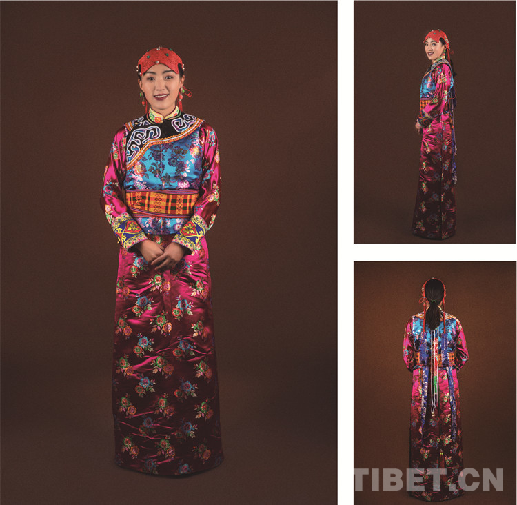 甘南州各县市的中心城镇,作为经济、文化交流中心,人们的服装无论用料、款式、色调等都与农牧区有一定差别。城镇居民一般喜欢以哔叽、毛呢或混纺为衣料,妇女尤讲究款式新颖合身。穿藏袍,里面都要穿衬衣,男式衬衣多半是高领,有大襟和对襟两种,用白色绸布作面料的居多;女式翻领用各种颜色的绸布做成。女式衬衣袖子较长,平时卷起,跳舞时放下,袖随舞起,翩若惊鸿。(中国西藏网 记者/李元梅 图片由甘南藏族自治州文化广电和旅游局提供)
