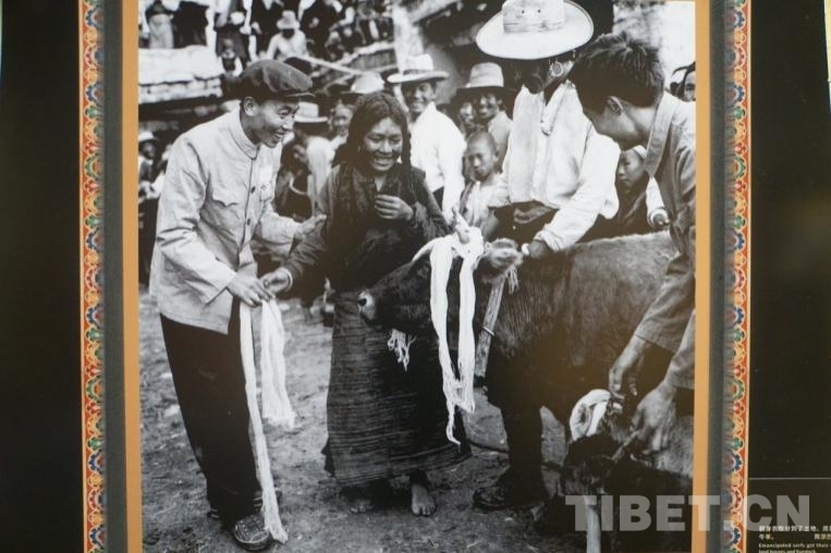 图为1959年拉萨街头的“小乞丐”卓玛(中)分到土地和牲畜 摄影:陈宗烈 翻拍:孙健