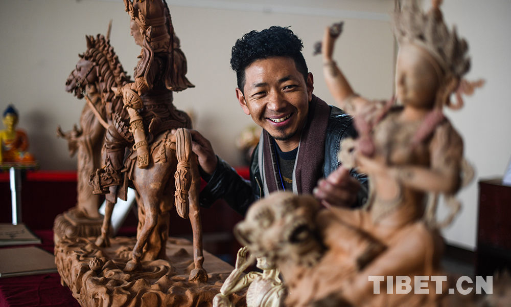 图为拉萨市堆龙德庆区的达瓦桑珠展示他的泥塑作品 摄影:普布扎西