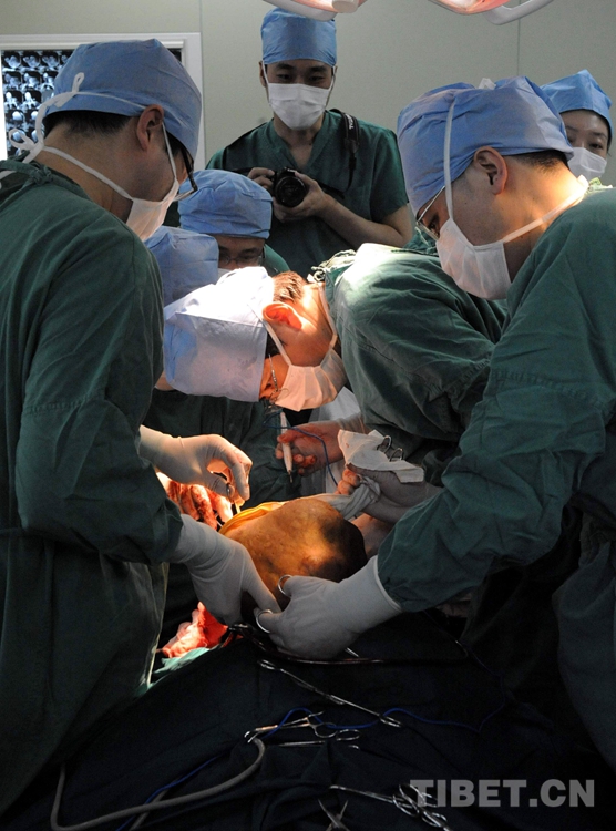 2010年4月21日,北京口腔医院口腔颌面外科医生在实施手术。当日上午11时许,北京口腔医院医生为藏族妇女斯求卓玛实施手术,将其脖子上一个重达5公斤的巨大肿瘤成功切除(唐召明2010年4月21日摄)