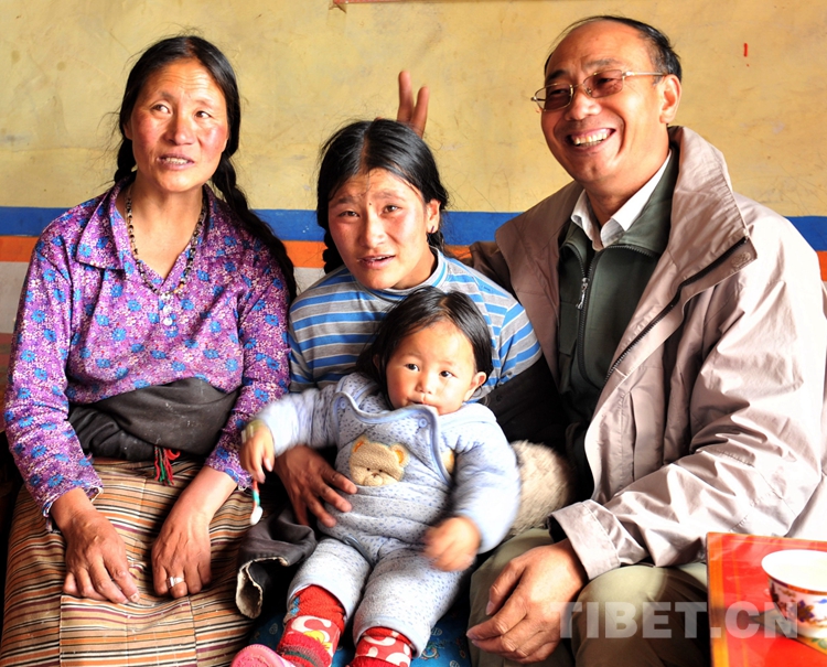 唐召明看望他曾帮助治病的斯求卓玛,并与住上新的安居房,抱上外孙,过上幸福生活的卓玛一家人合影留念(唐召明提供,2015年7月14日摄)