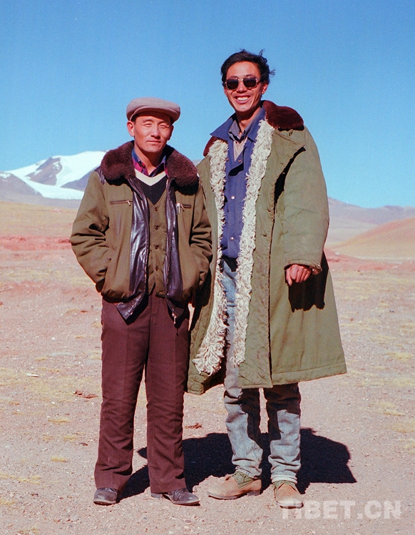 图为唐召明(右)第二次独闯藏北无人区时,与双湖办事处主任索朗公布在双湖办事处合影留念 (唐召明1988年摄)