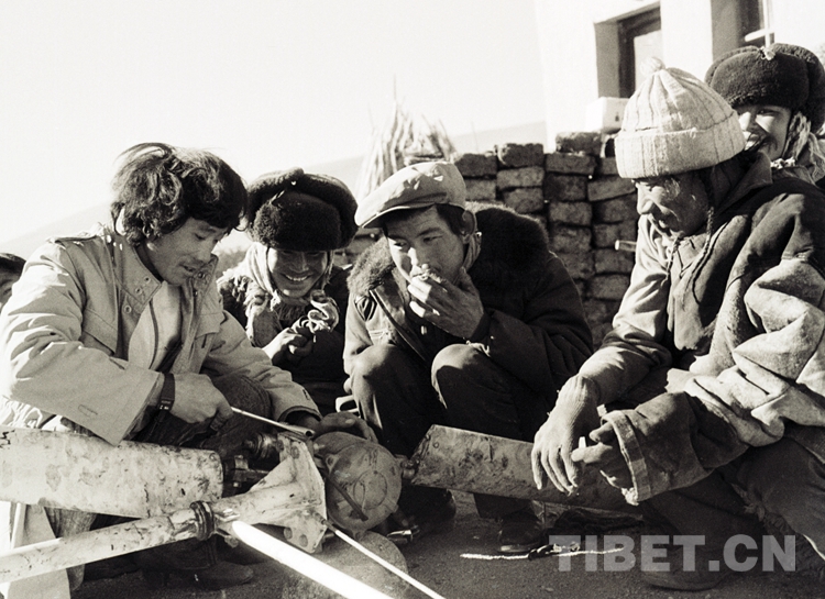 图为那曲科委风能实验站技术工人余和平(左一)在嘎措乡为牧民维修风力发电机。(唐召明1988年11月24日摄)