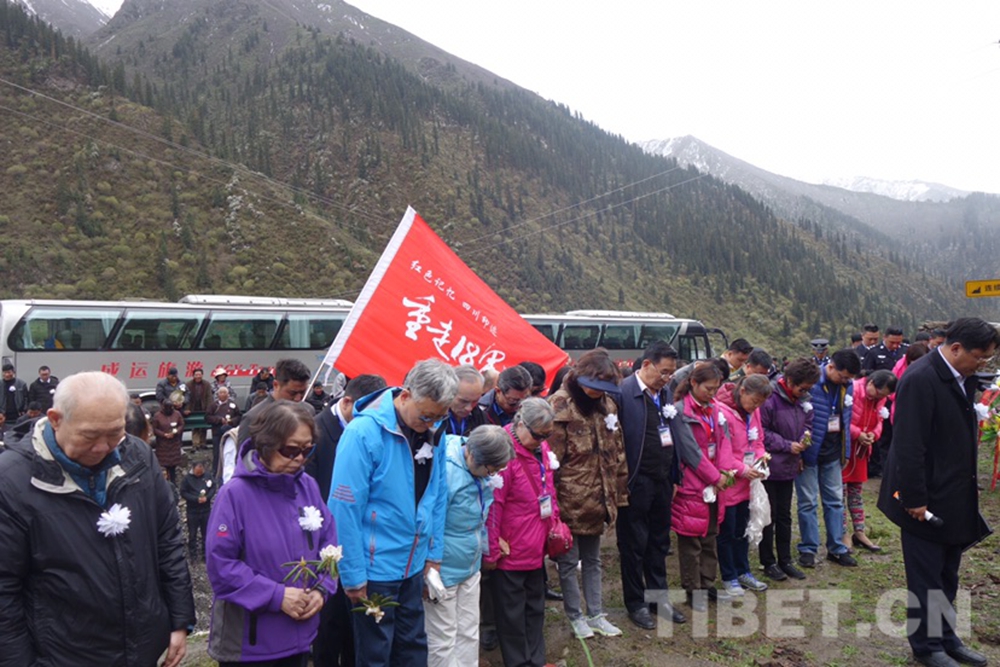 图为十八军老战士和十八军后代们在十八军进藏的无名女兵墓前敬献花篮并默哀