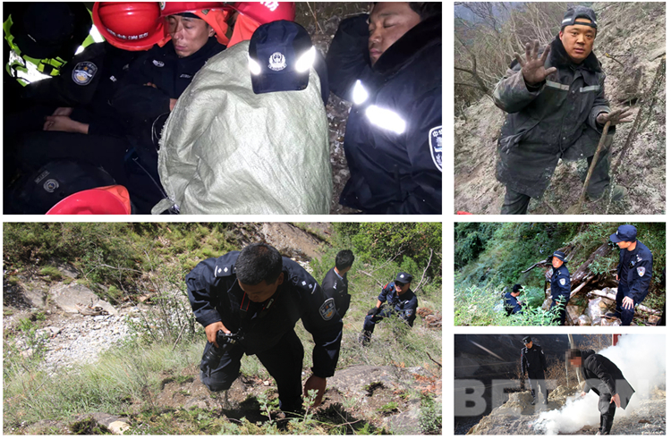 图为安康与同事们在执行各种任务时的画面。其中,左上图为安康(右一)与同事野外执行任务时就地和衣小憩;右上图为执行任务中的安康浑身是泥;左下图为安康带队爬山开展案件调查;右下图为安康在执行任务时责令违法人熄灭火点。