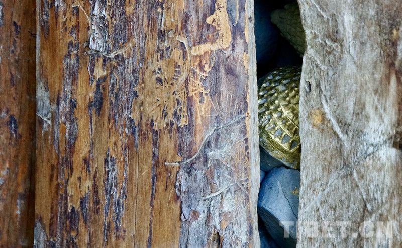 上百年的羊皮经筒,里面装着厚厚的一匝匝经卷,被若干次转动后,羊皮裂开了口子,巧手的藏族群众用皮绳将岁月的裂口密密缝住,经筒又可以转绕好多年。擦康被木板封住了,小虫在木板上啃蚀出画作一样的痕迹,木板缝隙中,闪耀着金色的光芒,光芒来自擦康里放置的擦塔——一个上面有着108座小塔的擦塔。