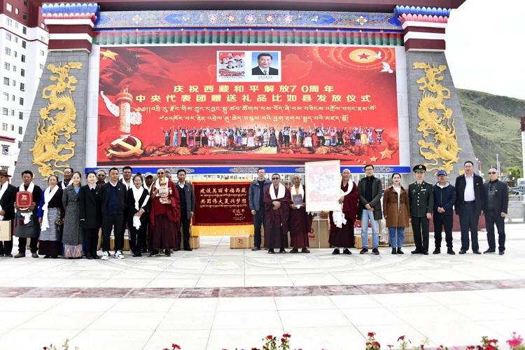 中国西藏网讯 为表达以习近平同志为核心的党中央的亲切关怀和全国人民的深情厚谊,出席西藏和平解放70周年庆祝活动的中央代表团向西藏赠送多项纪念品。8月23日下午,西藏自治区那曲市比如县隆重举行中央代表团赠送礼品发放仪式。
