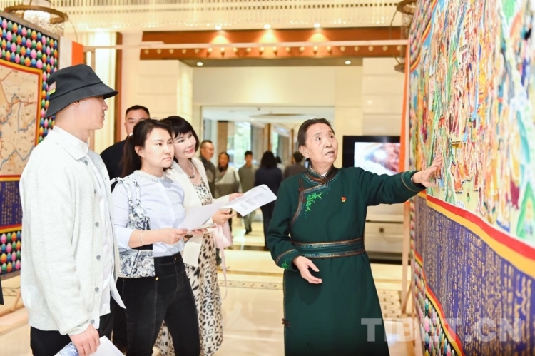 图为格日勒老人(右)向嘉宾介绍“仓央嘉措马鬃绕线长卷故事唐卡”