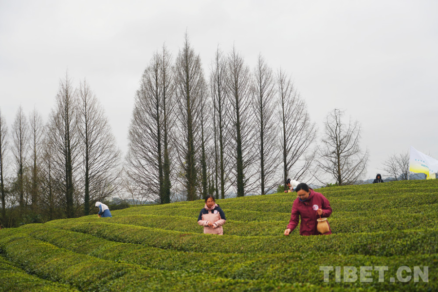 图为罗布央宗和明珠措姆在采茶