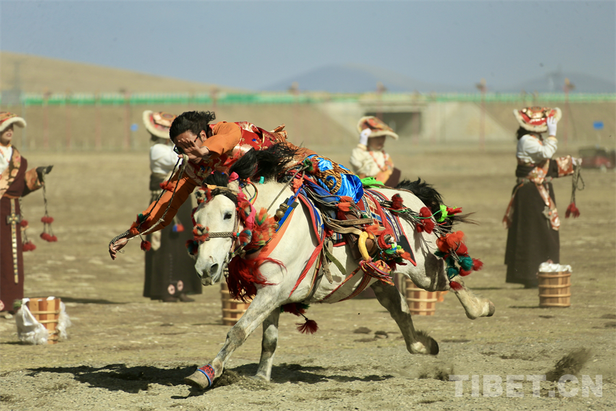 在海拔4000米左右的辽阔天地间,康巴汉子们驾驭着矫健的骏马、身着华美的传统服饰,如疾风般掠过金色的草原,在马背上展示跑马射箭、乘马射击、跑马拾哈达、跑马倒立、跑马悬体等高难度动作,马蹄声声、欢呼阵阵,交织成高原最豪迈的乐章。(中国西藏网 记者/毕然 龙真多吉)