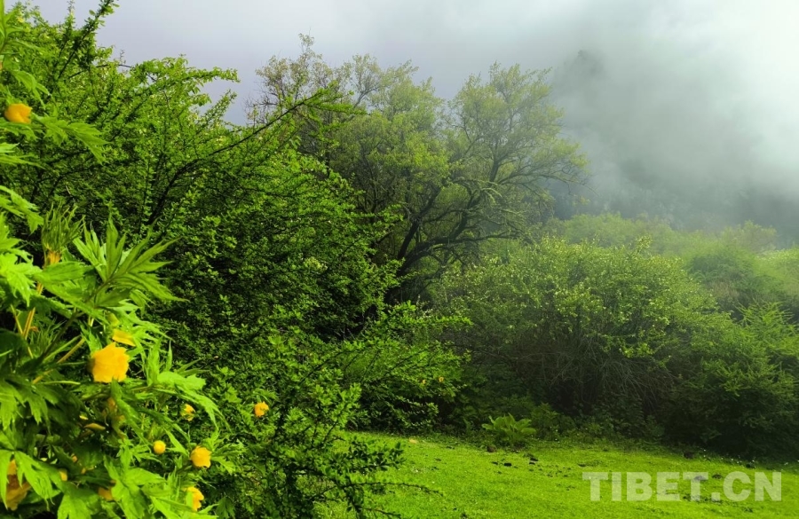 5月28日,南伊沟景区重新开园。图为景区内黄牡丹盛开,轻雾缭绕,绿意盎然 摄影:赵钊