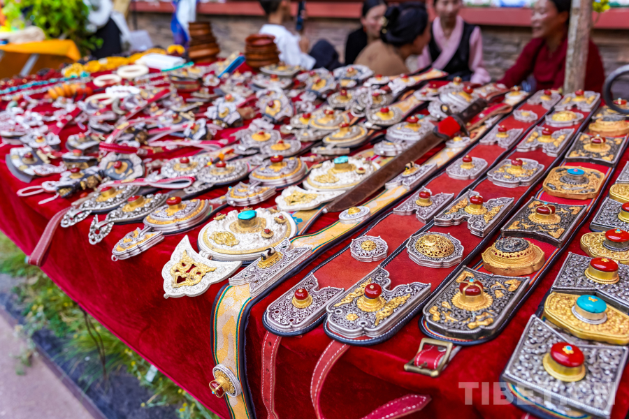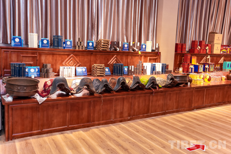 图为展区内摆放的各种藏香、马鞍、器皿以及农特产品