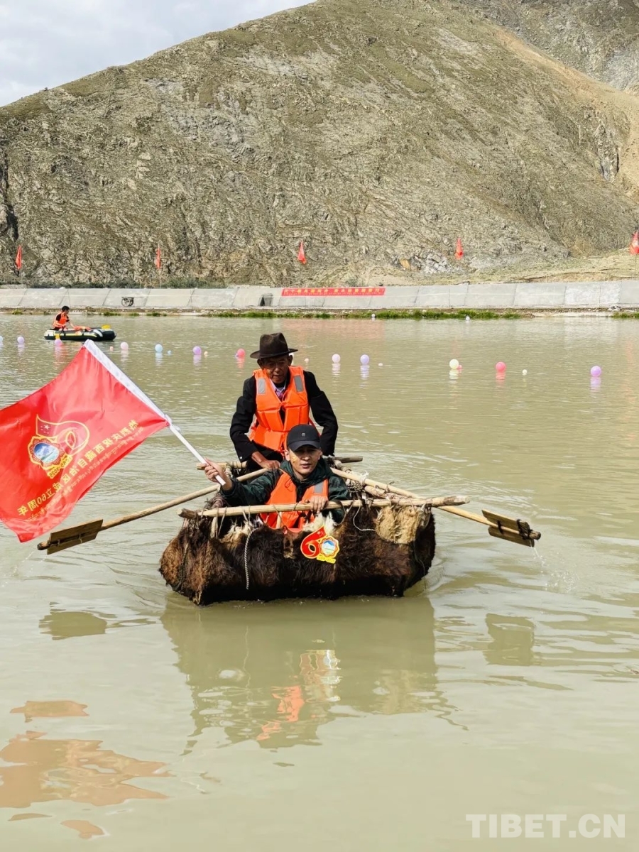 图为南木林县庆祝西藏自治区成立60周年文艺汇演中划牛皮船项目