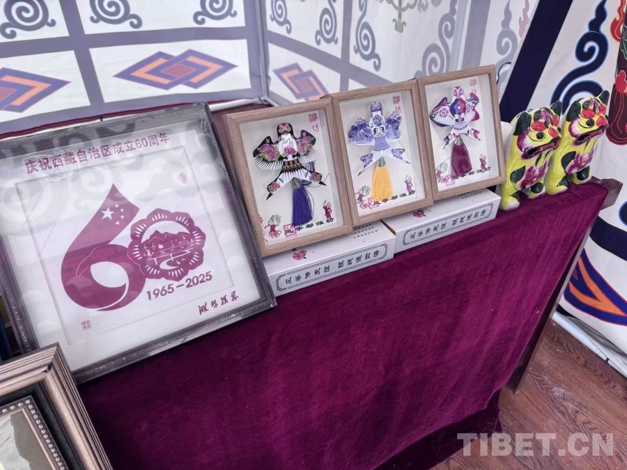 图为南木林县庆祝西藏自治区成立60周年文艺汇演现场所展示的剪纸和潍坊风筝