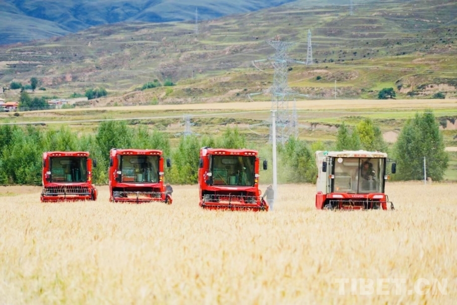 中国西藏网讯 8月29日,四川省甘孜藏族自治州甘孜县拖坝乡拖坝四村的500亩青稞基地里,收割机轰鸣作响,饱满的青稞穗被整齐收割。甘孜县12万亩青稞陆续成熟,高原上一片金黄。据甘孜县农牧农村和科技局数据显示,今年全县青稞预计总产量达27805吨,较去年增长4.9%,再创历史新高。