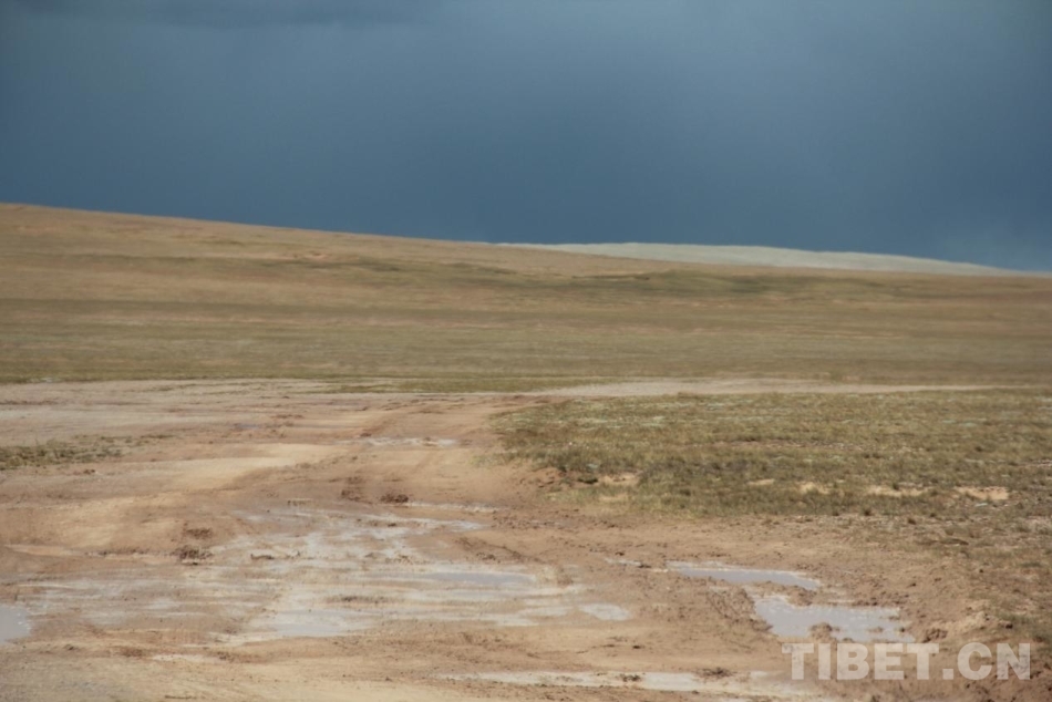 无人区的天气是片段式的,前脚还晴着,下步走进一块雨云下,车子就又会被淋个透。我们的车就中招了,在一片黑云压顶后,刷刷的小雨下了起来,不久又变成了冰雹。小小的冰块砸在路上融化,很快就把干的泥土裹了起来,路上顿时变得泥泞不堪。如果说石子路的颗粒感颠得人头晕,那么雨后泥路就黏黏糊糊的,车子仿佛在浸满水的海绵上走,快不了,也起不来。渐渐地,雨水大起来,渐渐汇成小溪,车辆驶过,又是一片水花四溅。