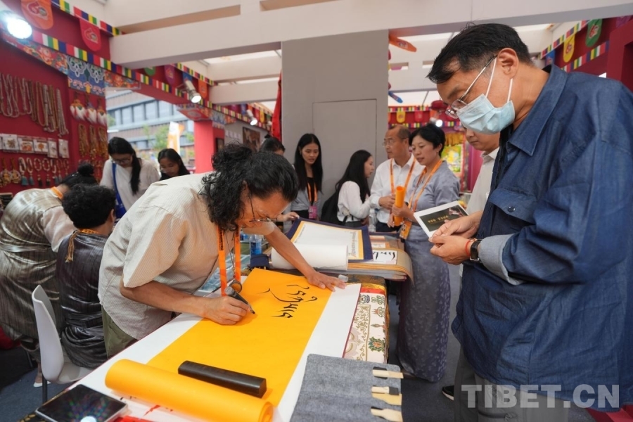 图为藏文书法老师在现场为参观人员书写祝福语