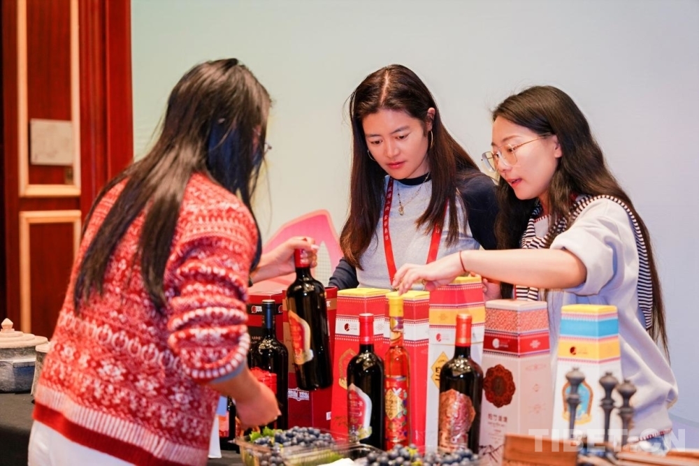 图为工作人员为现场嘉宾介绍桑日帕竹红酒