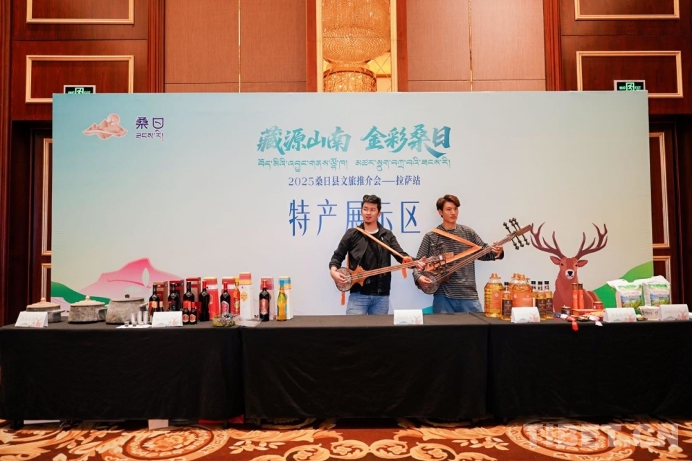 随后,原生态节目《扎西康桑》精彩上演。该节目源于自治区级非遗“巴朗卓巴谐玛”,以欢快的节奏和优美的舞姿,传递出桑日人民淳朴热情的好客之情。现场设置的特色展区同样引人注目:桑日帕竹红酒与葡萄、曲果萨糌粑、仁青岗高原菜籽油等农特产品琳琅满目,达古石锅、扎念琴等非遗产品也吸引了众多嘉宾驻足欣赏,生动呈现出桑日丰富的物产与深厚的文化底蕴。