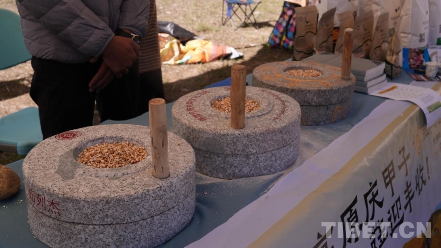 图为茹列杰展销点展示的磨糌粑用的石磨