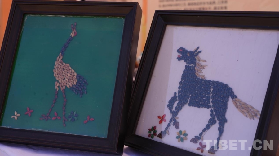 图为林周县箩曾绘画工作室负责人仁青多吉用青稞粒创作的文创产品
