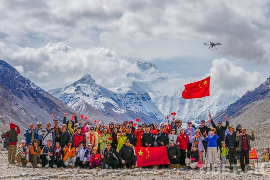 中国西藏网讯 国庆前夕,西藏日喀则边境管理支队珠峰边境派出所民警在珠峰大本营和游客举行了一场特殊的升旗仪式:一架无人机擎旗腾空,现场民警和群众齐唱国歌,五星红旗在雪域之巅迎风飘扬。(中国西藏网 通讯员/叶轶 记者/赵振宇)