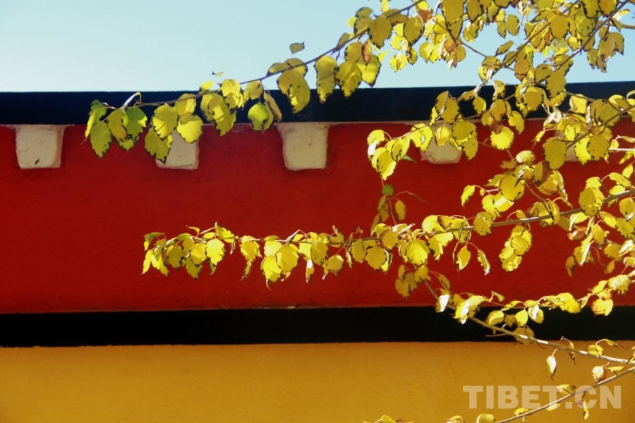 图为阿里狮泉河镇,红墙蓝天黄叶相得映彰 摄影:赵钊