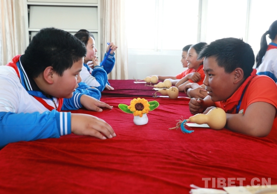 图为山东聊城堂邑镇中心小学学生向西藏阿里噶尔县孔繁森小学的小伙伴赠送并介绍妈妈亲手制作的向日葵小摆件 摄影:刘莉