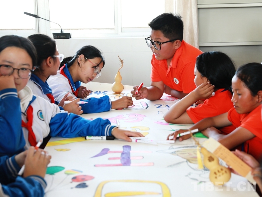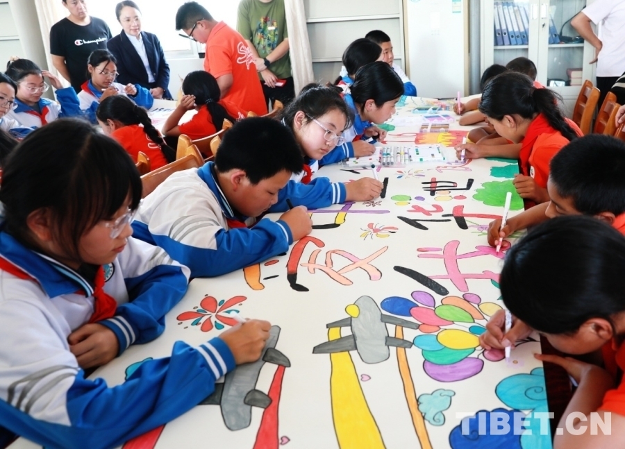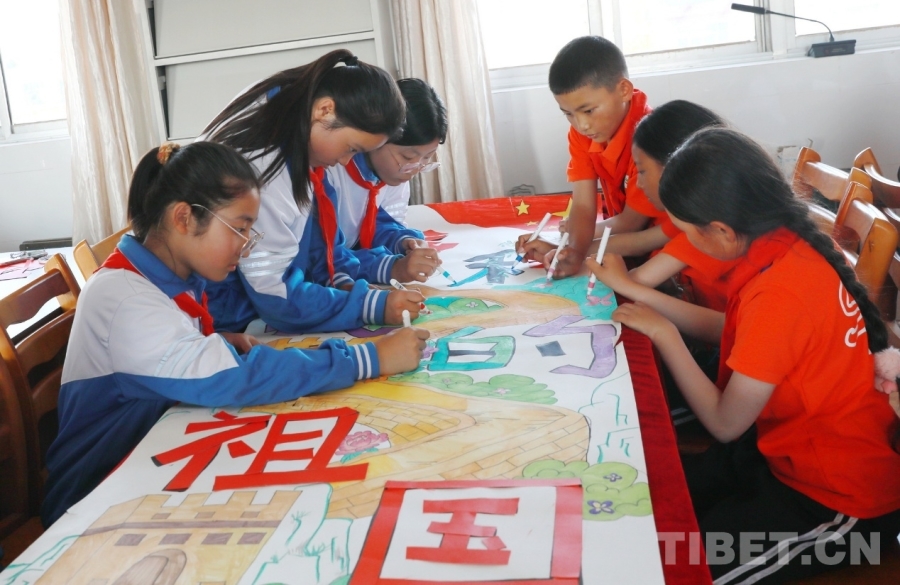 图为西藏阿里噶尔县孔繁森小学、山东聊城堂邑镇中心小学的孩子们共同创作迎国庆主题画卷 摄影:刘莉