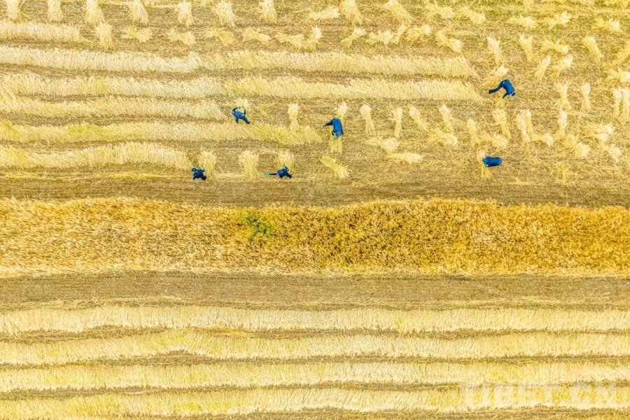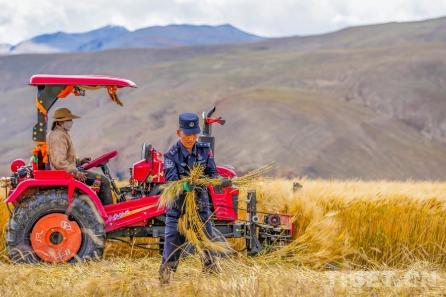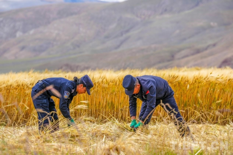 中国西藏网讯 金秋时节,青稞飘香。9月底,西藏日喀则边境管理支队涅如麦边境派出所民警们深入田间,在广袤的田野上,与农牧民一同俯身劳作,挥镰收割,抢收青稞。金黄麦浪中,那一抹抹“警察蓝”与辛勤的群众构成了一幅警民情深、秋收喜悦的动人画卷。(中国西藏网 通讯员/叶轶 记者/赵振宇)