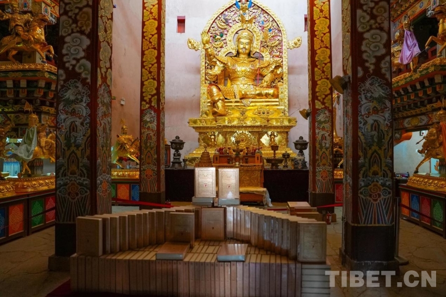 资料图:青海省果洛藏族自治州达日县格萨尔王狮龙宫殿内的格萨尔王塑像及《格萨尔》书籍 摄影:赵振宇