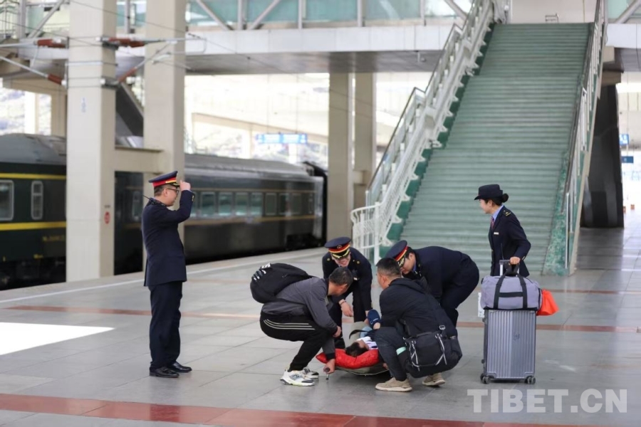 图为拉萨火车站客运值班员对特殊旅客提供特殊转运帮助