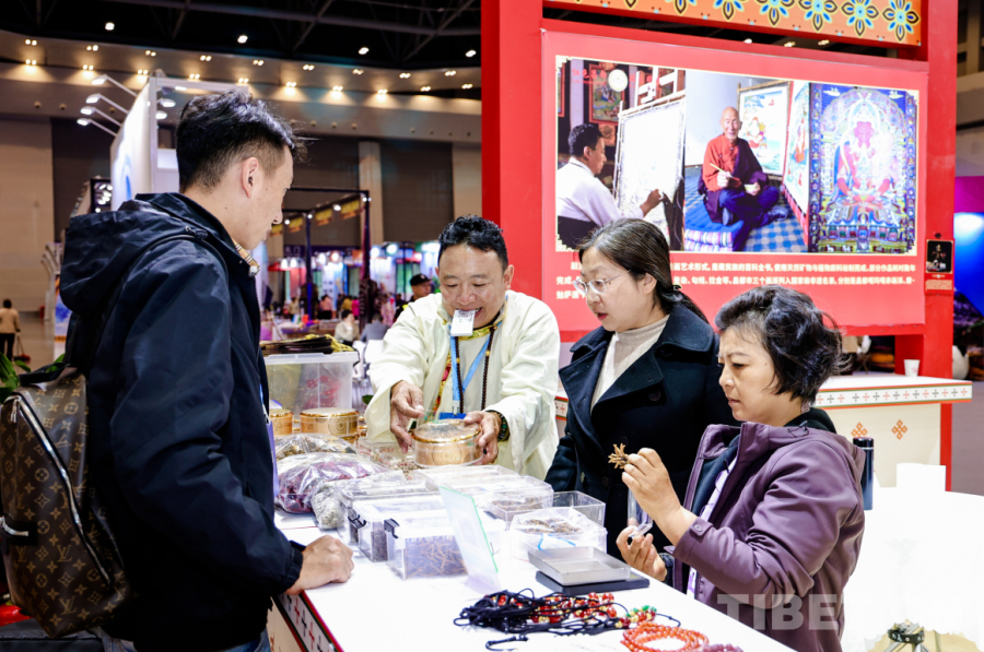 记者走进昌都展馆,整个展馆呈现藏族传统建筑的典型特征,厚重的墙体、错落有致的布局以及富有层次感的屋顶线条,精心融入康巴文化符号。昌都文旅携9家非遗企业,全方位展示唐卡、藏香、唐卡漆画、民族手工饰品、虫草、贝母、藏红花等琳琅满目的文旅产品,进馆参与互动、咨询的游客络绎不绝。