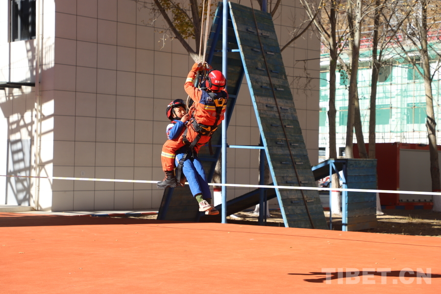 图为模拟高空索降救援,消防员怀抱孩童安全演练,体验惊险救援瞬间。