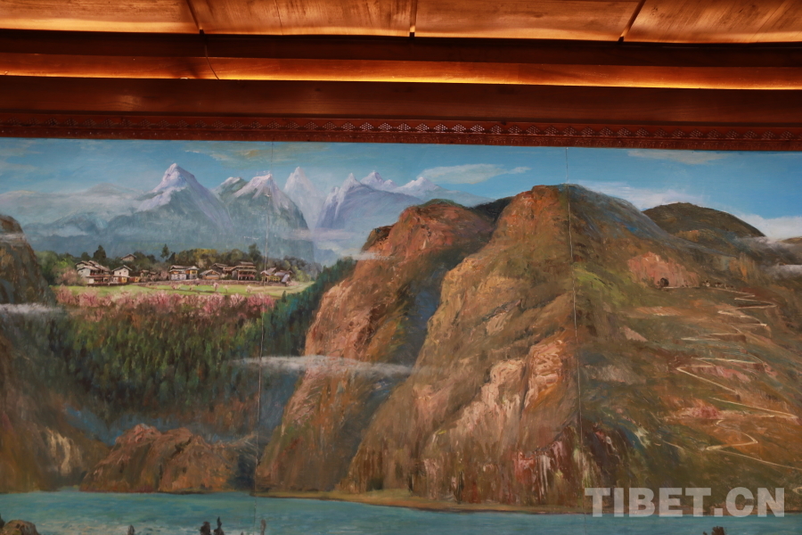 图为色龙村内建筑上的壁画,生动描绘了色龙村所处的特殊地理条件,右边的盘山公路蜿蜒通过隧道之后而有左边的“桃花源” 摄影:王妍丹