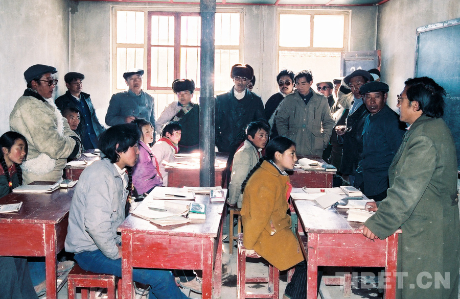 这是参加文部办事处基层政权建设工作现场会“访问团”人员在参观文部办事处小学(唐召明1989年12月份摄)