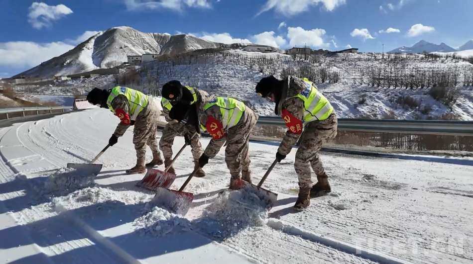 图为官兵人工铲雪