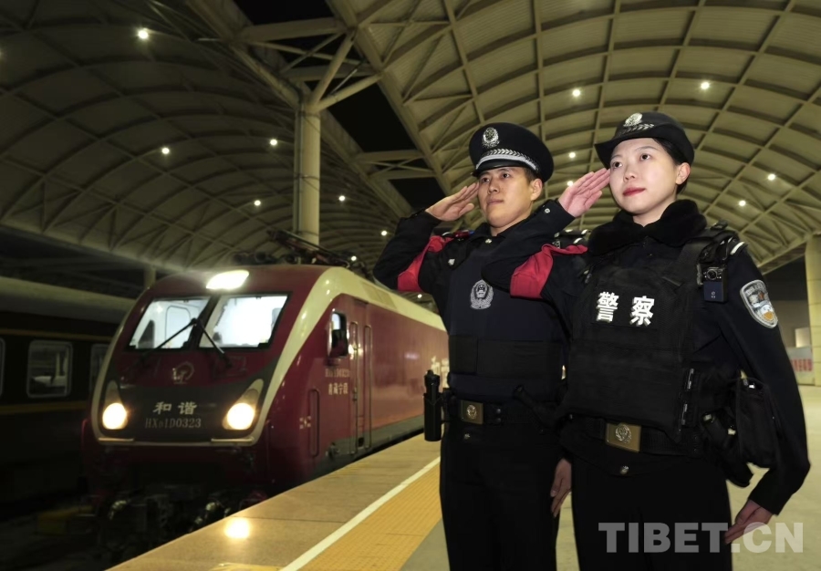2月2日凌晨时分,随着清脆的火车汽笛声响起,西宁铁路公安处春运的大幕正式拉开。图为站台上,民警庄严敬礼,目送满载旅客的列车缓缓启程。